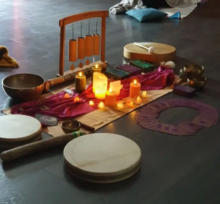 - Sons vibratoires issus d’instruments (bols, tambours, bâtons de pluie, koshis…),